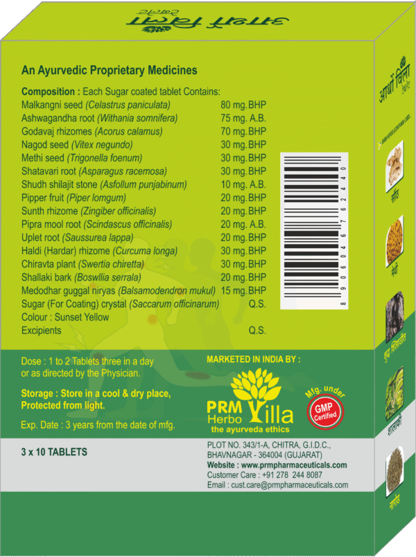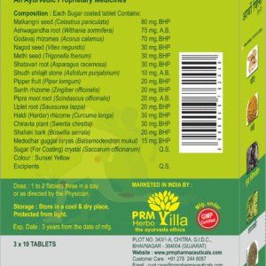 The anti-inflammatory herbs like Rasna, Nirgundi, and Guggulu work to reduce joint swelling and pain. Ashwagandha and Shallaki promote cartilage health, while Dashmool and Punarnava help rejuvenate the body’s musculoskeletal system.