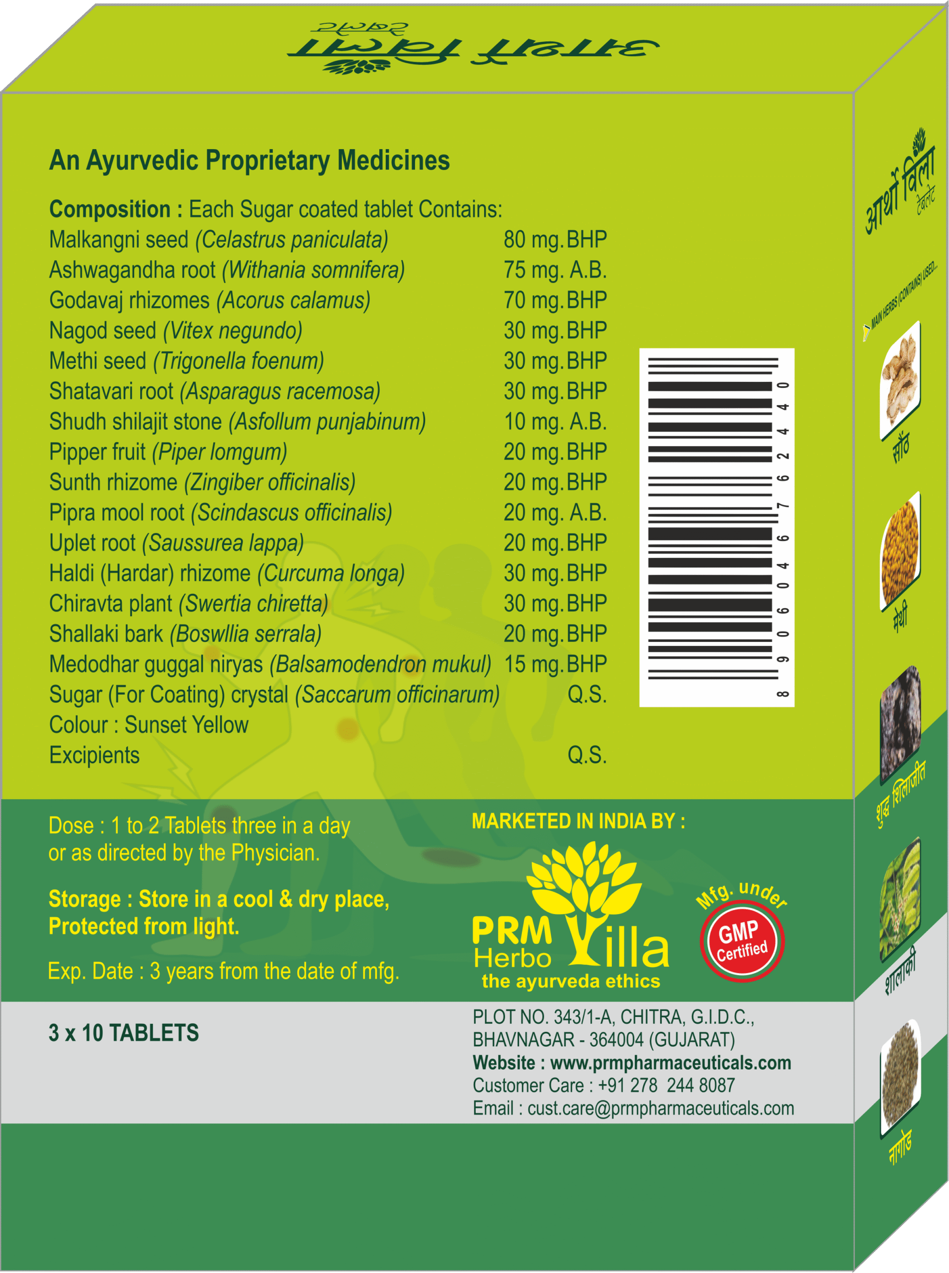 PRM Artho Villa Ayurvedic Arthritis Tablet is a powerful herbal blend designed to manage arthritis symptoms such as joint pain, stiffness, swelling, and restricted mobility. It draws from ancient Ayurvedic wisdom to offer long-lasting support to the joints and muscles without harmful side effects.