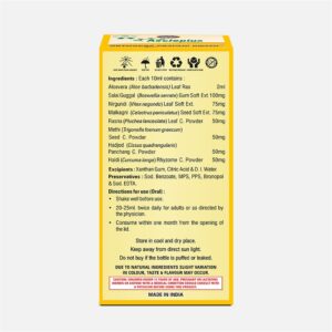 Herbs like Nirgundi and Shallaki act as anti-inflammatory agents, reducing pain and stiffness in joints. Guggulu and Ashwagandha strengthen the bones and improve flexibility. The combined action helps restore joint mobility and reduces discomfort from chronic pain conditions.