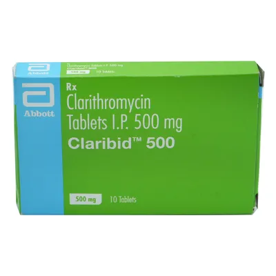Claribid 500 Tablet by Abbott contains Clarithromycin (500mg), a broad-spectrum macrolide antibiotic that inhibits bacterial protein synthesis, preventing bacterial growth and helping the body fight infections. This high-strength tablet is commonly prescribed for respiratory tract infections, skin infections, ear infections, and other bacterial infections.