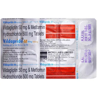 A combination of two antidiabetic medicines (Metformin 500mg + Vildagliptin 50mg) used to control high blood sugar levels in Type 2 Diabetes Mellitus.